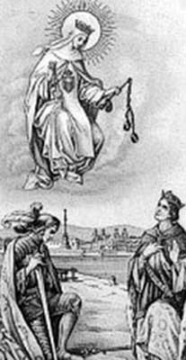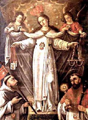 The Blessed Virgin appeared to Saint Peter, to his confessor, Raymund of Pennafort, and to King James of Aragon, and through these three men established a work of the redemption of captives. She desired the establishment of the Mercedarian religious order. (derives from the Spanish word for mercy - merced) Its members would seek to free Christian captives and offer themselves, if necessary, as an exchange. |